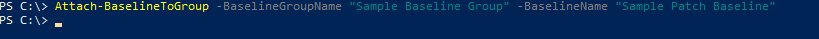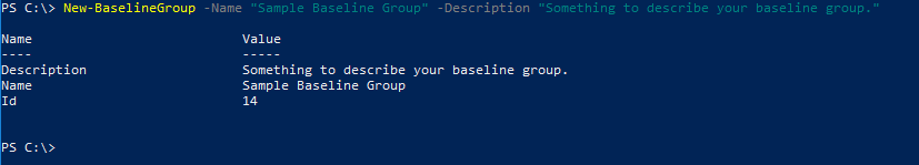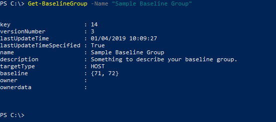 This has created an empty baseline group called “Sample Baseline Group”. An object is returned representing the new group. We now need to add either patch baselines, an image baseline, or both.