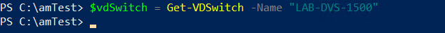 Let’s take a look at the first example where we report on the status of an uplink “dvUplink1” on all port groups on DV switch “LAB-DVS-1500”. First, we get the distributed switch object: