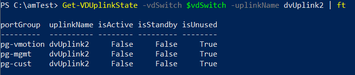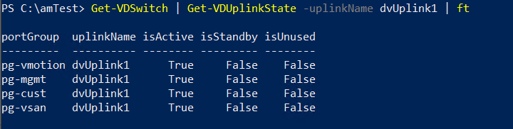 The first function was written to review current configuration, and to confirm the new configuration. It will get the configuration state of an uplink for all port groups on a particular switch, whether that is “Assigned”, “Standby” or “Unused”.